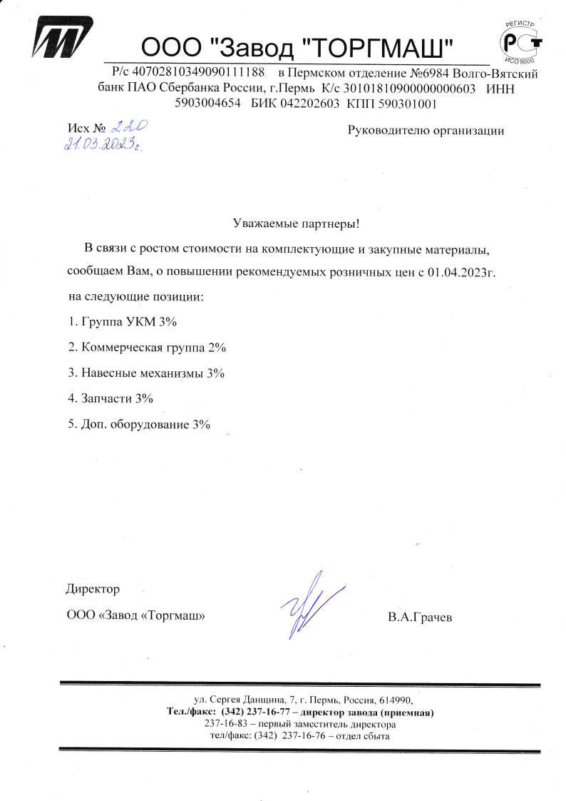 ООО "Завод Торгмаш" (г.Пермь) уведомляет о повышении цен на оборудование ТМ "Торгмаш" с 1 апреля 2023 года в связи с ростом цен на материалы и комплектующие.