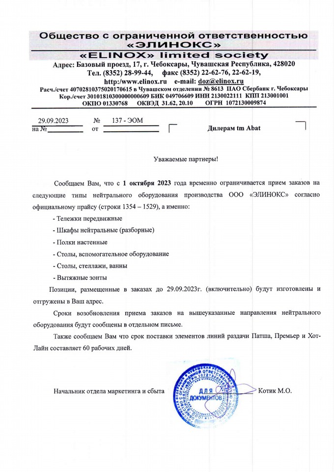 С 1 октября 2023 г. временно ограничивается прием заказов на нейтральное оборудование ООО "Элинокс"